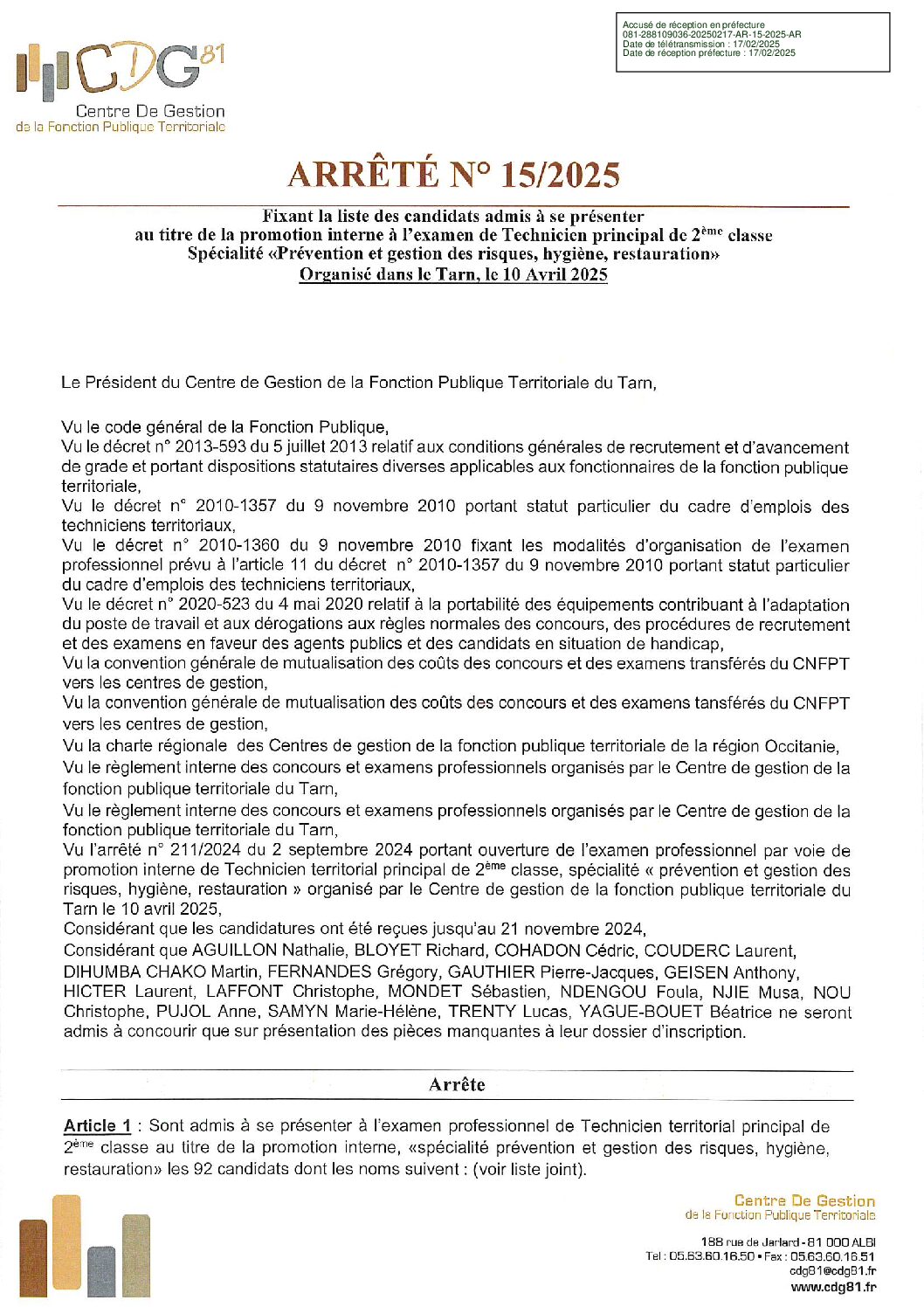 Voir l'image agrandie Arrêté admis à se présenter : ex technicien pl 2e cl PI (2025) Arrêté admis à se présenter : examen technicien principal 2e classe PI (2025) Type de fichier : pdf File Size: 864 Ko Catégories: 2025 Balises : 2005, PI,, promotion interne, session 2025, technicien principal Par Thomas|2025-12-09T17:57:42+01:0009/12/2025|Commentaires fermés sur Arrêté admis à se présenter : ex technicien pl 2e cl PI (2025) Share This Story, Choose Your Platform! FacebookXRedditLinkedInWhatsAppTelegramTumblrPinterestVkXingEmail À propos de l'auteur : Thomas
