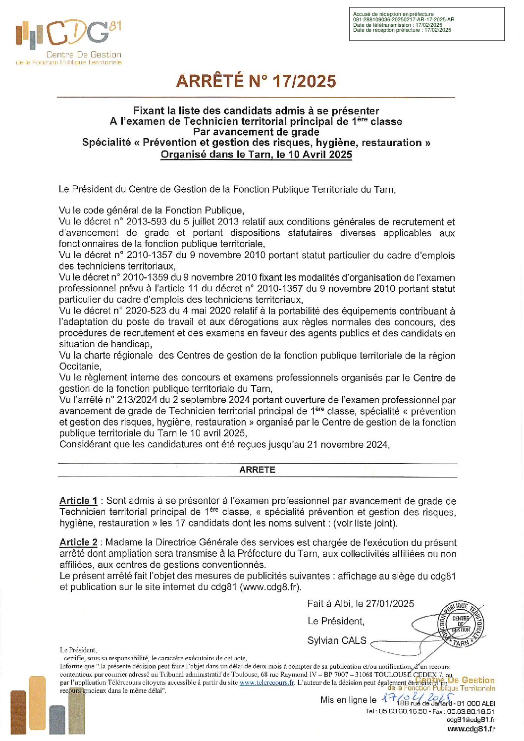 Arrêté admis à se présenter : examen technicien principal 1ère classe AG (session 2025)