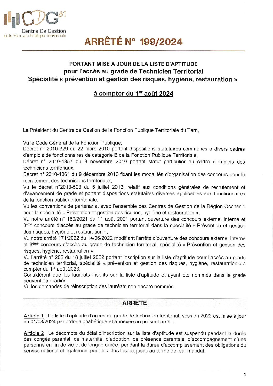 Voir l'image agrandie Arrêté màj liste aptitude technicien territorial 01.08.24 Type de fichier : pdf File Size: 611 Ko Catégories: 2024 Par Thomas|2025-12-09T17:55:23+01:0009/12/2025|Commentaires fermés sur Arrêté màj liste aptitude technicien territorial 01.08.24 Share This Story, Choose Your Platform! FacebookXRedditLinkedInWhatsAppTelegramTumblrPinterestVkXingEmail À propos de l'auteur : Thomas