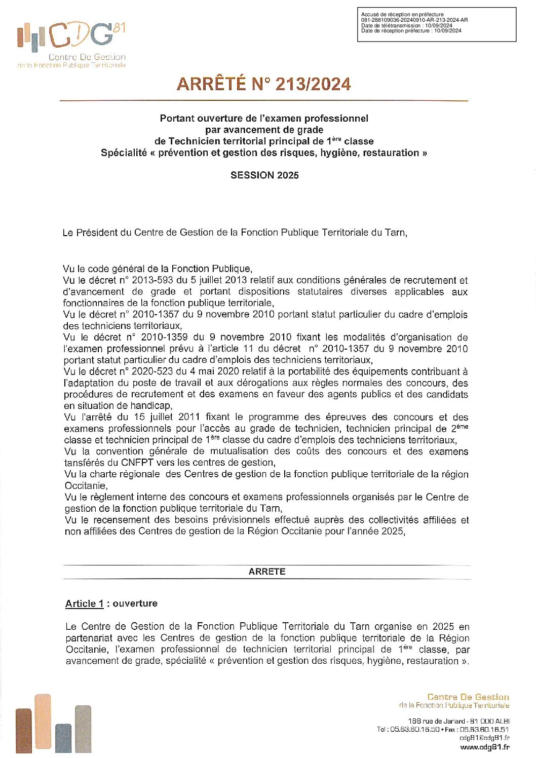 Voir l'image agrandie Arrêté : ouverture examen tech pl 1ère cl AG Arrêté : ouverture examen technicien principal 1ère classe (session 2025) Type de fichier : pdf File Size: 815 Ko Catégories: 2024 Balises : 2025, arrêté d'ouverture, examen, session 2025, technicien principal 1ère classe Par Thomas|2025-12-09T17:55:51+01:0009/12/2025|Commentaires fermés sur Arrêté : ouverture examen tech pl 1ère cl AG Share This Story, Choose Your Platform! FacebookXRedditLinkedInWhatsAppTelegramTumblrPinterestVkXingEmail À propos de l'auteur : Thomas
