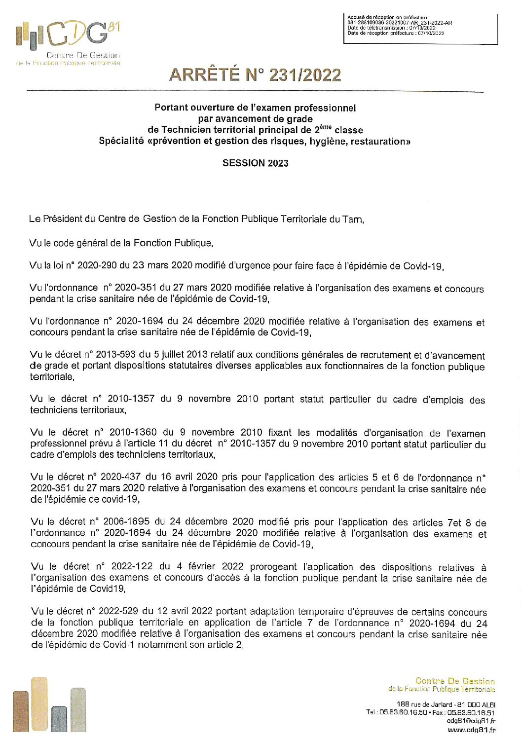 Voir l'image agrandie Arrêté : ouverture examen technicien principal de 2ème classe AG (2023) Arrêté : ouverture examen technicien principal 2ème classe AG (2023) Type de fichier : pdf File Size: 1 000 Ko Catégories: 2022 Balises : 2023, AG, arrêté d'ouverture, avancement de grade, examen, session 2023, technicien principal, technicien territorial Par Thomas|2025-12-09T17:52:45+01:0009/12/2025|Commentaires fermés sur Arrêté : ouverture examen technicien principal de 2ème classe AG (2023) Share This Story, Choose Your Platform! FacebookXRedditLinkedInWhatsAppTelegramTumblrPinterestVkXingEmail À propos de l'auteur : Thomas