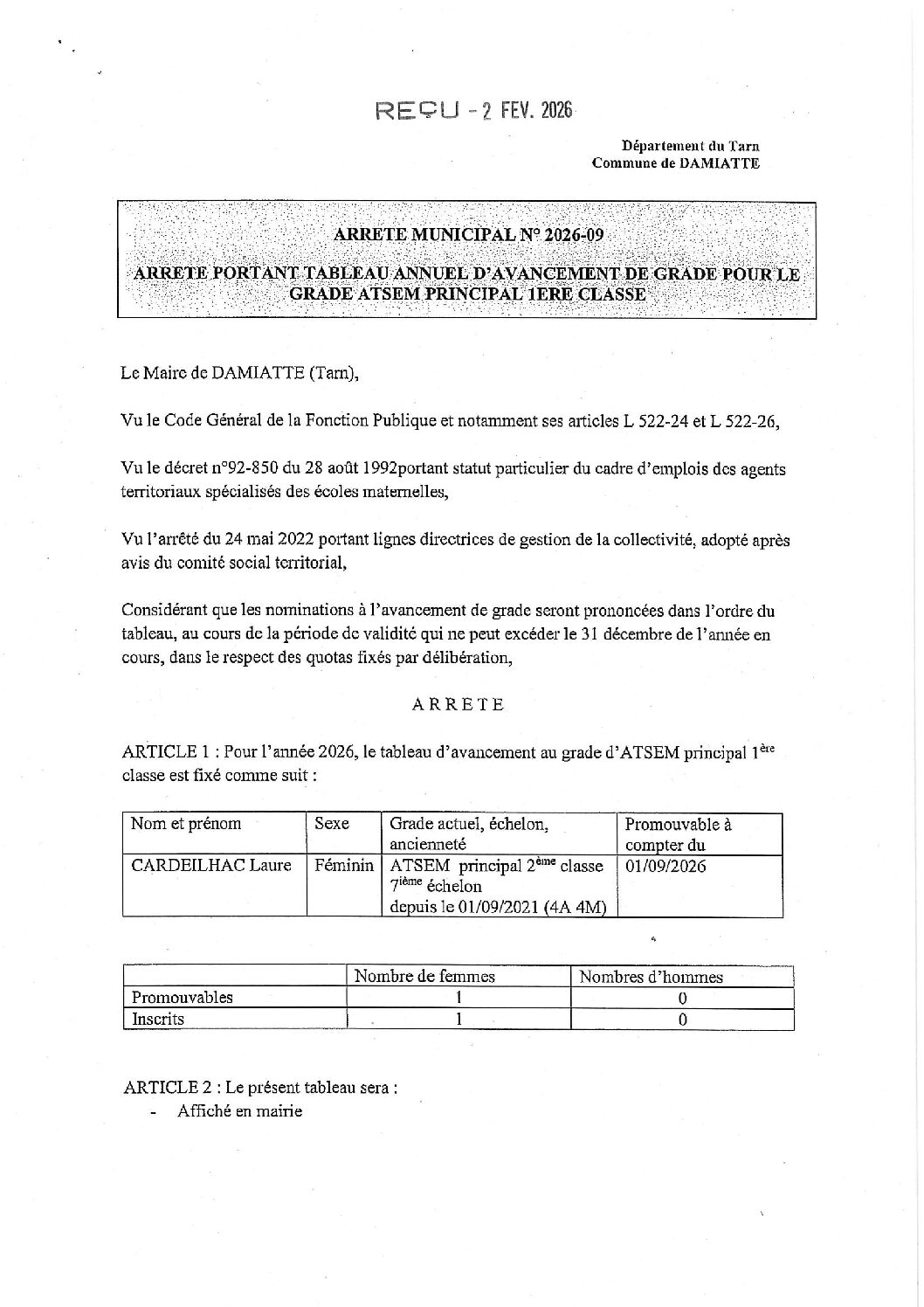 Voir l'image agrandie Av. de grade 2026 : Damiatte Type de fichier : pdf File Size: 438 Ko Catégories: Avancement de grade (tableaux annuels) Balises : annuel, arrêté, avancement, grade, tableau Par Aurélie CHABBERT|2026-02-02T15:50:58+01:0002/02/2026|Commentaires fermés sur Av. de grade 2026 : Damiatte Share This Story, Choose Your Platform! FacebookXRedditLinkedInWhatsAppTelegramTumblrPinterestVkXingEmail À propos de l'auteur : Aurélie CHABBERT