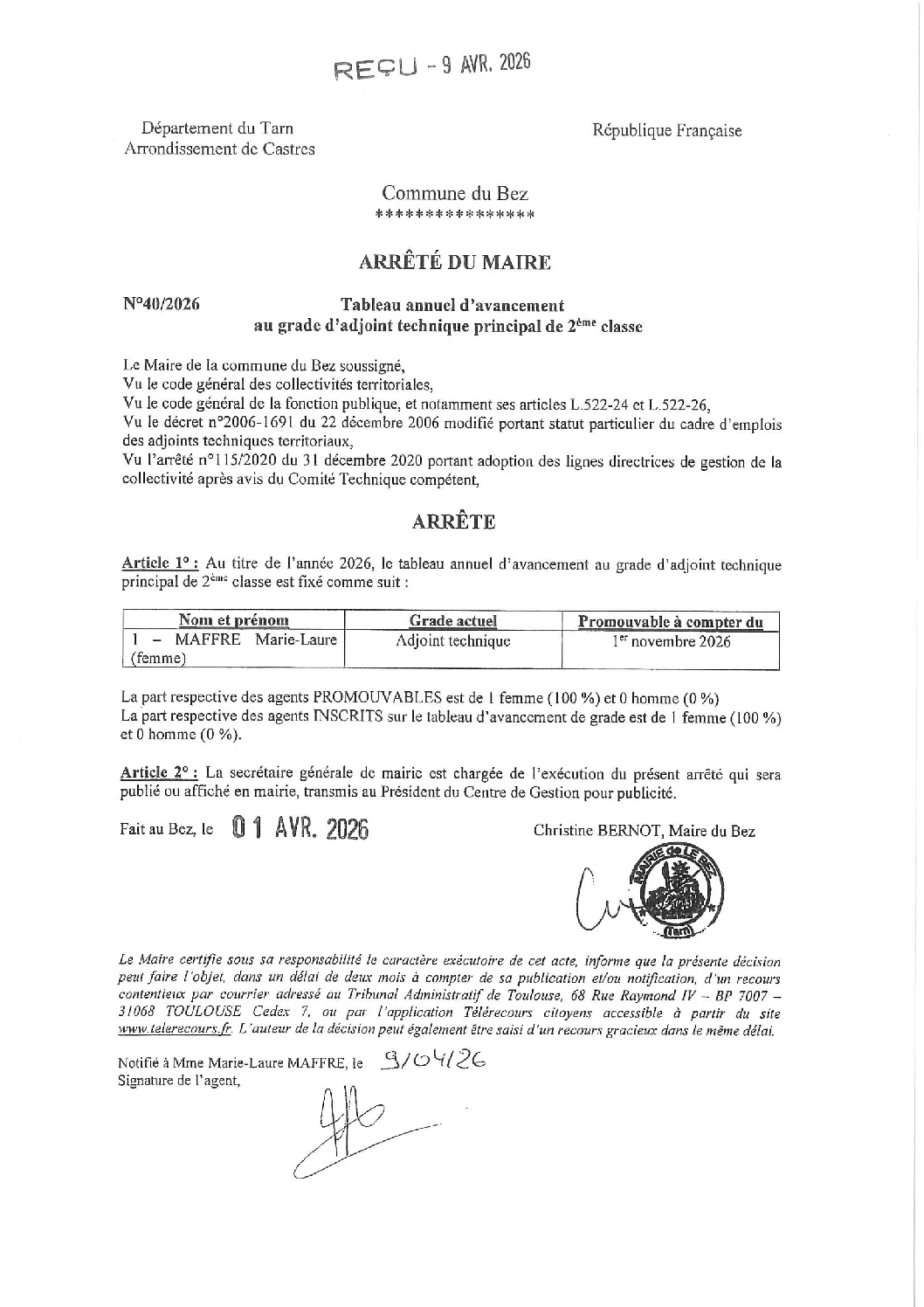 Voir l'image agrandie Av. de grade 2026 : Le Bez Type de fichier : pdf File Size: 245 Ko Catégories: Avancement de grade (tableaux annuels) Balises : annuel, arrêté, avancement, grade, tableauPar Aurélie CHABBERT|2026-04-09T10:54:52+02:0009/04/2026|Commentaires fermés sur Av. de grade 2026 : Le BezShare This Story, Choose Your Platform!FacebookXRedditLinkedInWhatsAppTelegramTumblrPinterestVkXingEmail À propos de l'auteur : Aurélie CHABBERT