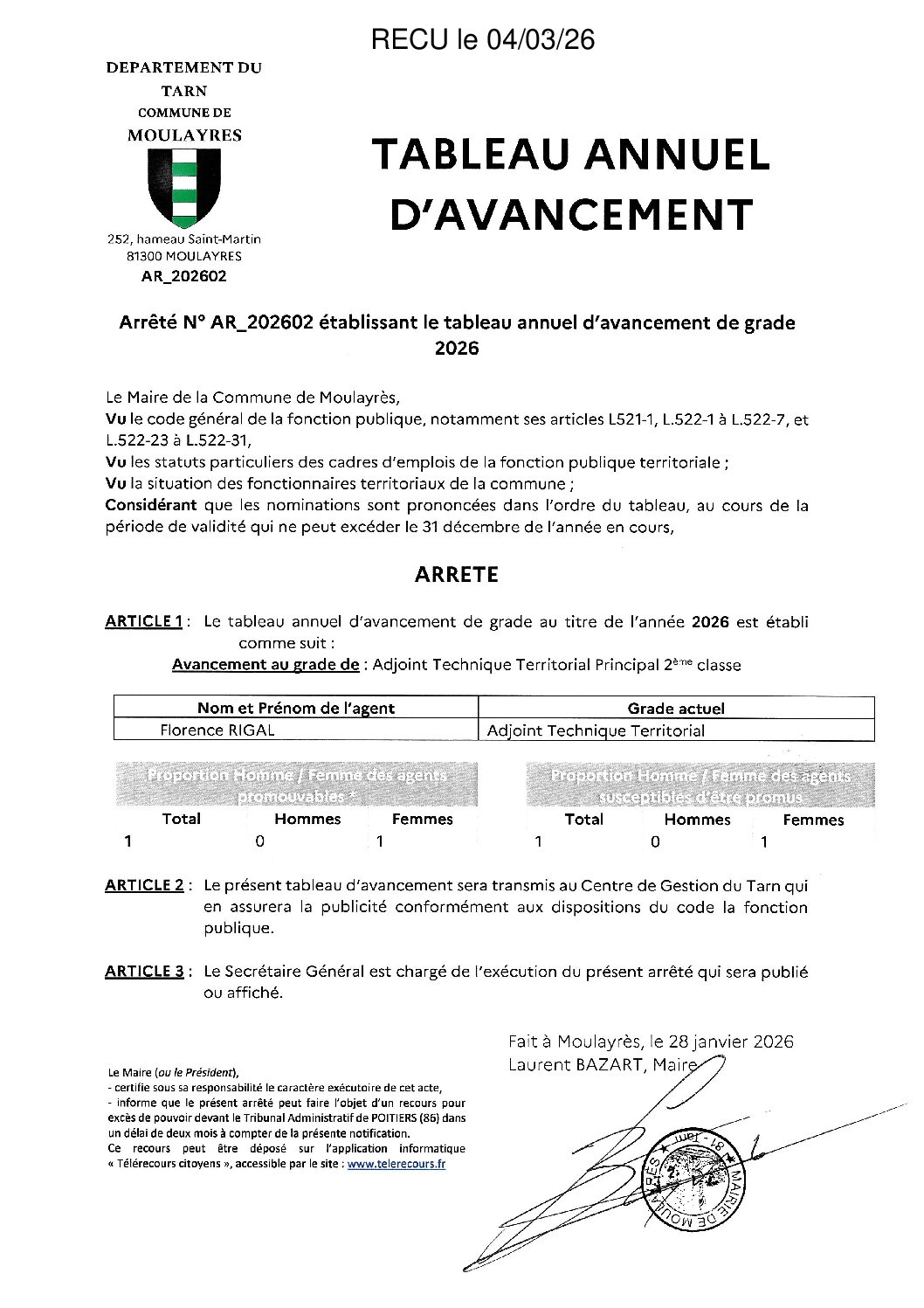 Voir l'image agrandie Av. de grade 2026 : Moulayres Type de fichier : pdf File Size: 768 Ko Catégories: Avancement de grade (tableaux annuels) Balises : annuel, arrêté, avancement, grade, tableau Par Aurélie CHABBERT|2026-03-04T09:05:57+01:0004/03/2026|Commentaires fermés sur Av. de grade 2026 : Moulayres Share This Story, Choose Your Platform! FacebookXRedditLinkedInWhatsAppTelegramTumblrPinterestVkXingEmail À propos de l'auteur : Aurélie CHABBERT