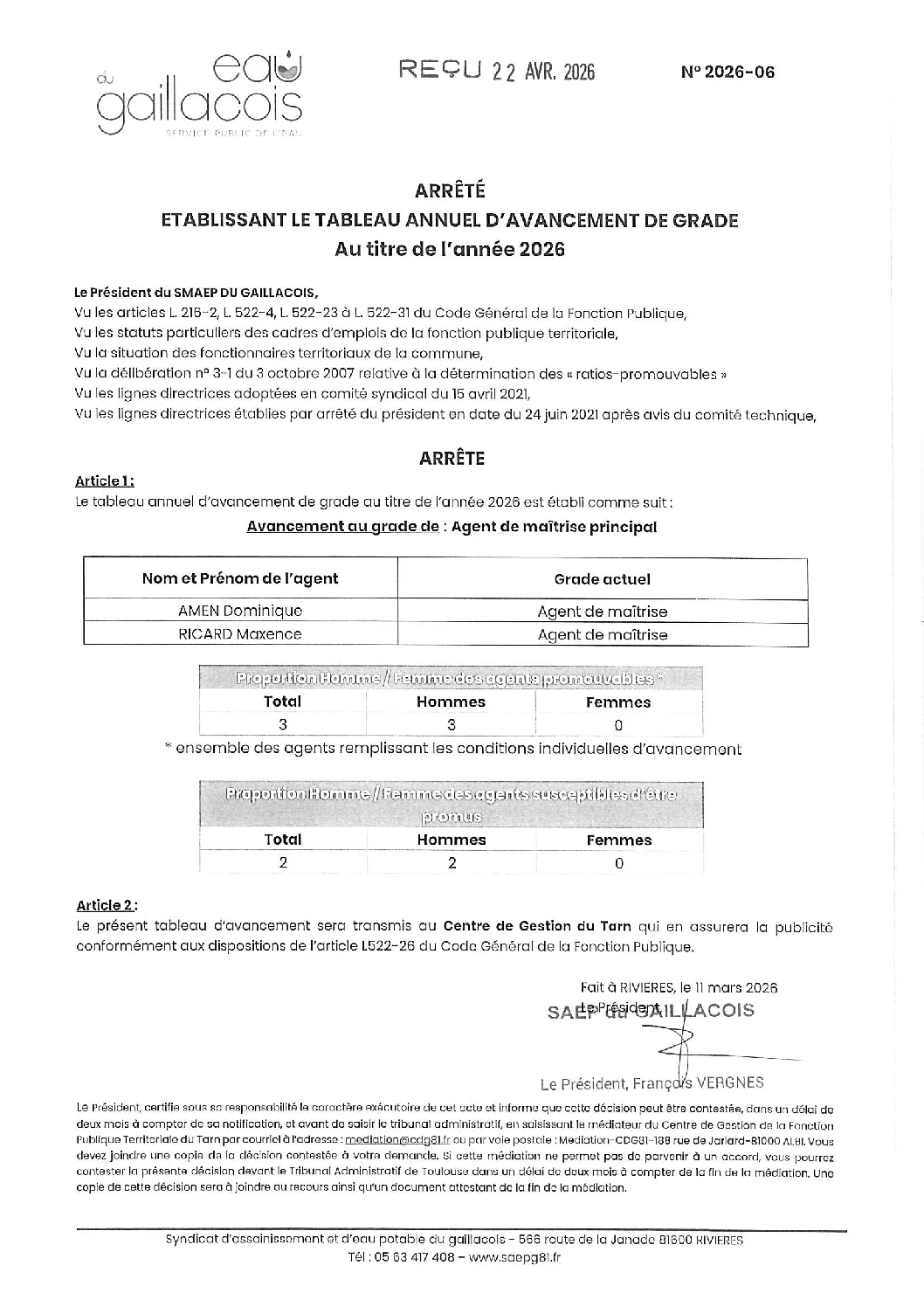 Voir l'image agrandie Av. de grade 2026 : SMAEP du Gaillacois Type de fichier : pdf File Size: 302 Ko Catégories: Avancement de grade (tableaux annuels) Balises : annuel, arrêté, avancement, grade, tableauPar Syvie Mazars|2026-04-22T08:40:50+02:0022/04/2026|0 commentaireShare This Story, Choose Your Platform!FacebookXRedditLinkedInWhatsAppTelegramTumblrPinterestVkXingEmail À propos de l'auteur : Syvie Mazars