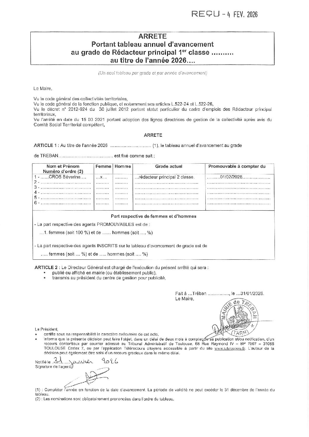 Voir l'image agrandie Av. de grade 2026 : Tréban Arrêté portant tableau annuel d’avancement de grade Type de fichier : pdf File Size: 268 Ko Catégories: Avancement de grade (tableaux annuels) Balises : annuel, arrêté, avancement, grade, tableau Par Syvie Mazars|2026-02-04T16:32:19+01:0004/02/2026|Commentaires fermés sur Av. de grade 2026 : Tréban Share This Story, Choose Your Platform! FacebookXRedditLinkedInWhatsAppTelegramTumblrPinterestVkXingEmail À propos de l'auteur : Syvie Mazars