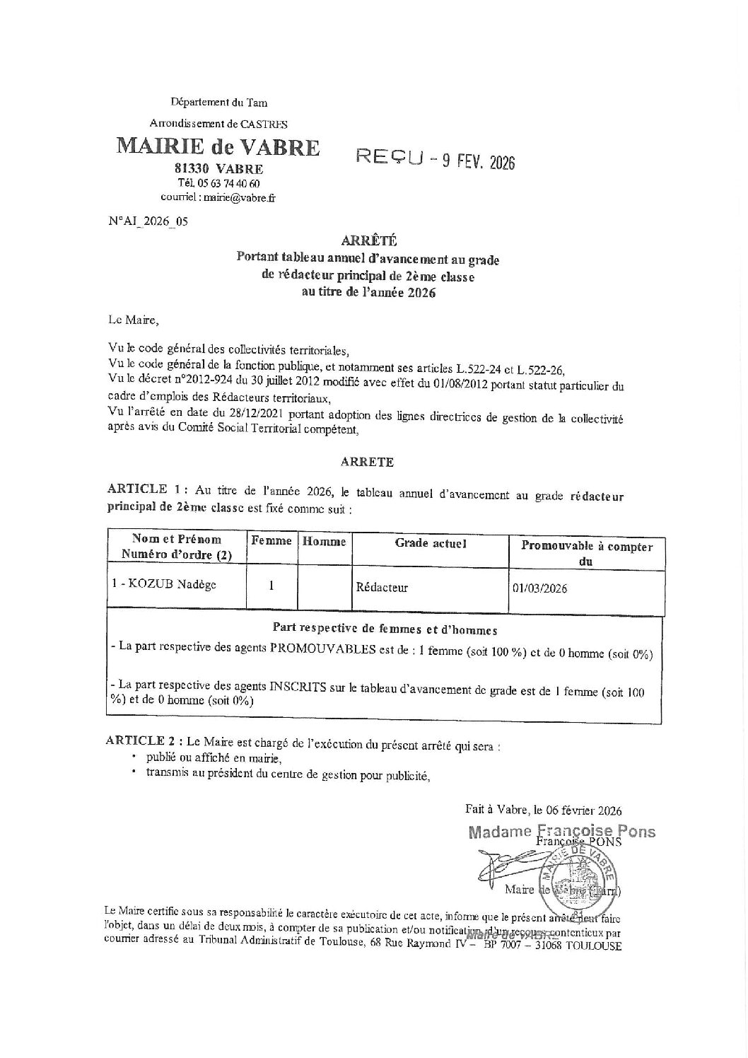 Voir l'image agrandie Av. de grade 2026 : Vabre Type de fichier : pdf File Size: 728 Ko Catégories: Avancement de grade (tableaux annuels) Balises : annuel, arrêté, avancement, grade, tableau Par Aurélie CHABBERT|2026-02-09T15:22:10+01:0009/02/2026|Commentaires fermés sur Av. de grade 2026 : Vabre Share This Story, Choose Your Platform! FacebookXRedditLinkedInWhatsAppTelegramTumblrPinterestVkXingEmail À propos de l'auteur : Aurélie CHABBERT