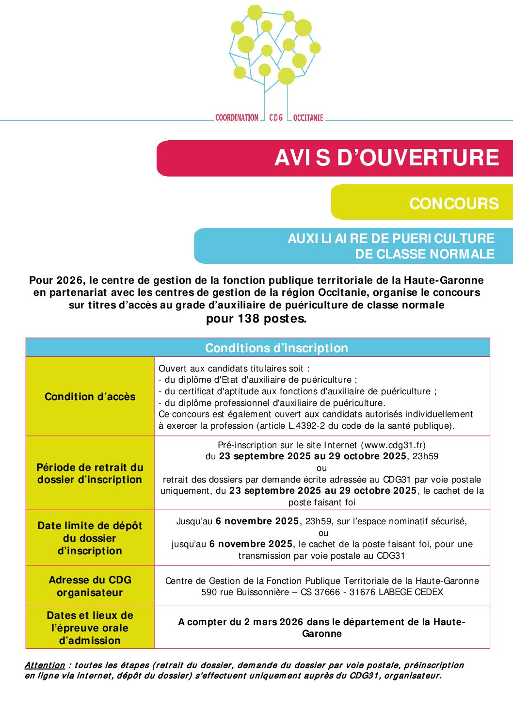Voir l'image agrandie Avis auxiliaire de puéricultrice (session 2026) Avis de concours : auxiliaire de puériculture (session 2026)1 o Type de fichier : pdf File Size: 48 Ko Catégories: Avis d'ouverture concours Balises : auxiliaire de puériculture, avis, avis de concours Par Thomas|2025-12-09T18:00:39+01:0009/12/2025|Commentaires fermés sur Avis auxiliaire de puéricultrice (session 2026) Share This Story, Choose Your Platform! FacebookXRedditLinkedInWhatsAppTelegramTumblrPinterestVkXingEmail À propos de l'auteur : Thomas