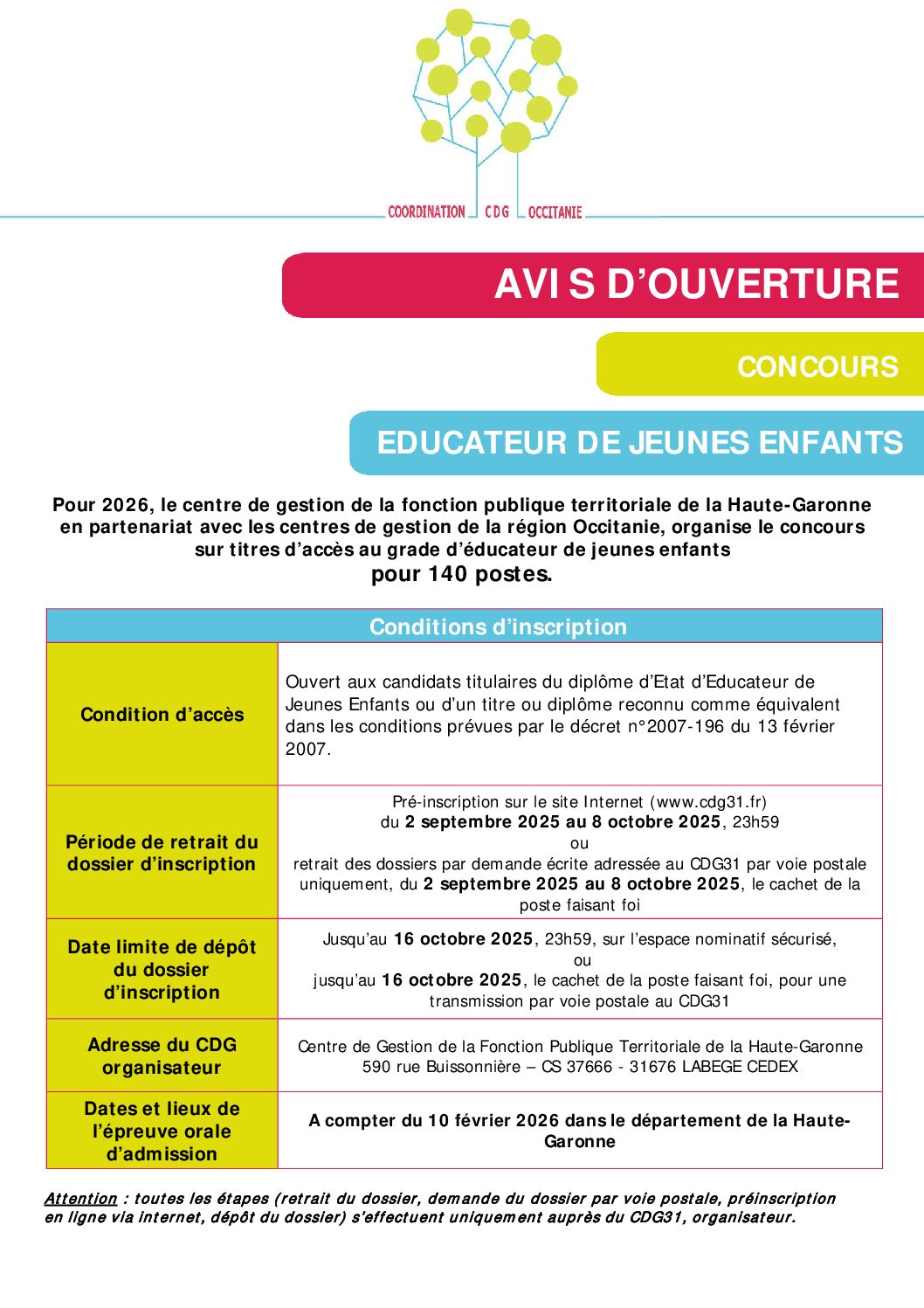 Voir l'image agrandie Avis de concours éducateur de jeunes enfants (session 2026) Avis de concours éducateur de jeunes enfants (session 2026) Type de fichier : pdf File Size: 48 Ko Catégories: Avis d'ouverture concours Balises : 2026, avis de concours, éducateur de jeunes enfants, eje, session 2026 Par Thomas|2025-12-09T18:00:41+01:0009/12/2025|Commentaires fermés sur Avis de concours éducateur de jeunes enfants (session 2026) Share This Story, Choose Your Platform! FacebookXRedditLinkedInWhatsAppTelegramTumblrPinterestVkXingEmail À propos de l'auteur : Thomas