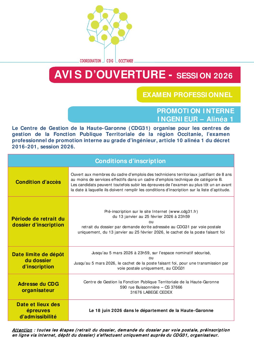 Voir l'image agrandie Avis d’examen ingénieur territorial alinéa 1 (cdg31) Type de fichier : pdf File Size: 48 Ko Catégories: Avis d'ouverture examens, Concours et examens Balises : 2026, avis d'examen, ingénieur Par Pascale Roumec|2026-01-15T09:56:53+01:0001/15/2026|Commentaires fermés sur Avis d’examen ingénieur territorial alinéa 1 (cdg31) Share This Story, Choose Your Platform! FacebookXRedditLinkedInWhatsAppTelegramTumblrPinterestVkXingEmail À propos de l'auteur : Pascale Roumec