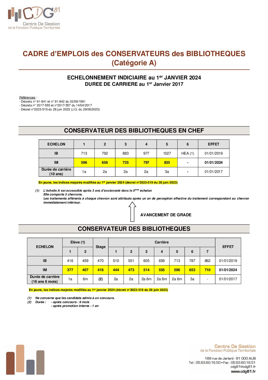 Voir l'image agrandie Echelle indiciaire (catégorie A) : conservateur des bibliothèques Janvier 2024 Echelle indiciaire Catégorie A – conservateur des bibliothèques Janvier 2024 Type de fichier : pdf File Size: 123 Ko Catégories: Catégorie A Balises : échelle, échelon, grille, indices, indiciaire Par Thomas|2025-12-09T17:53:54+01:0009/12/2025|Commentaires fermés sur Echelle indiciaire (catégorie A) : conservateur des bibliothèques Janvier 2024 Share This Story, Choose Your Platform! FacebookXRedditLinkedInWhatsAppTelegramTumblrPinterestVkXingEmail À propos de l'auteur : Thomas