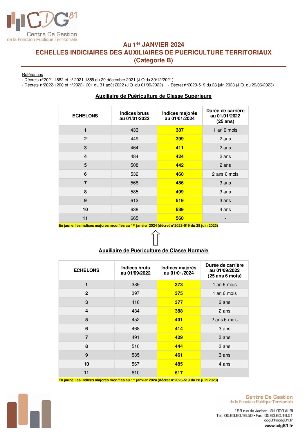 Voir l'image agrandie Echelle indiciaire (catégorie B) : auxiliaire de puériculture Janvier 2024 Echelle indiciaire Catégorie B – auxiliaire de puériculture Janvier 2024 Type de fichier : pdf File Size: 57 Ko Catégories: Catégorie B Balises : échelle, échelon, grille, indices, indiciaire Par Thomas|2025-12-09T17:54:13+01:0009/12/2025|Commentaires fermés sur Echelle indiciaire (catégorie B) : auxiliaire de puériculture Janvier 2024 Share This Story, Choose Your Platform! FacebookXRedditLinkedInWhatsAppTelegramTumblrPinterestVkXingEmail À propos de l'auteur : Thomas
