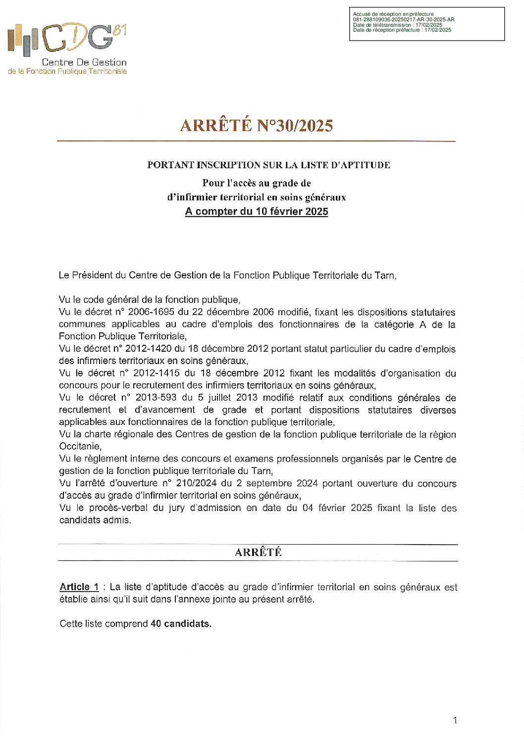 Voir l'image agrandie Liste d’aptitude : infirmier territorial en soins généraux (session 2025) Liste aptitude : infirmier territorial en soins généraux (session 2025) Type de fichier : pdf File Size: 661 Ko Catégories: Infirmier territorial session 2025 Balises : 2025, infirmier, infirmier en soins généraux, Liste aptitude, session 2025 Par Thomas|2025-12-09T17:57:47+01:0009/12/2025|Commentaires fermés sur Liste d’aptitude : infirmier territorial en soins généraux (session 2025) Share This Story, Choose Your Platform! FacebookXRedditLinkedInWhatsAppTelegramTumblrPinterestVkXingEmail À propos de l'auteur : Thomas