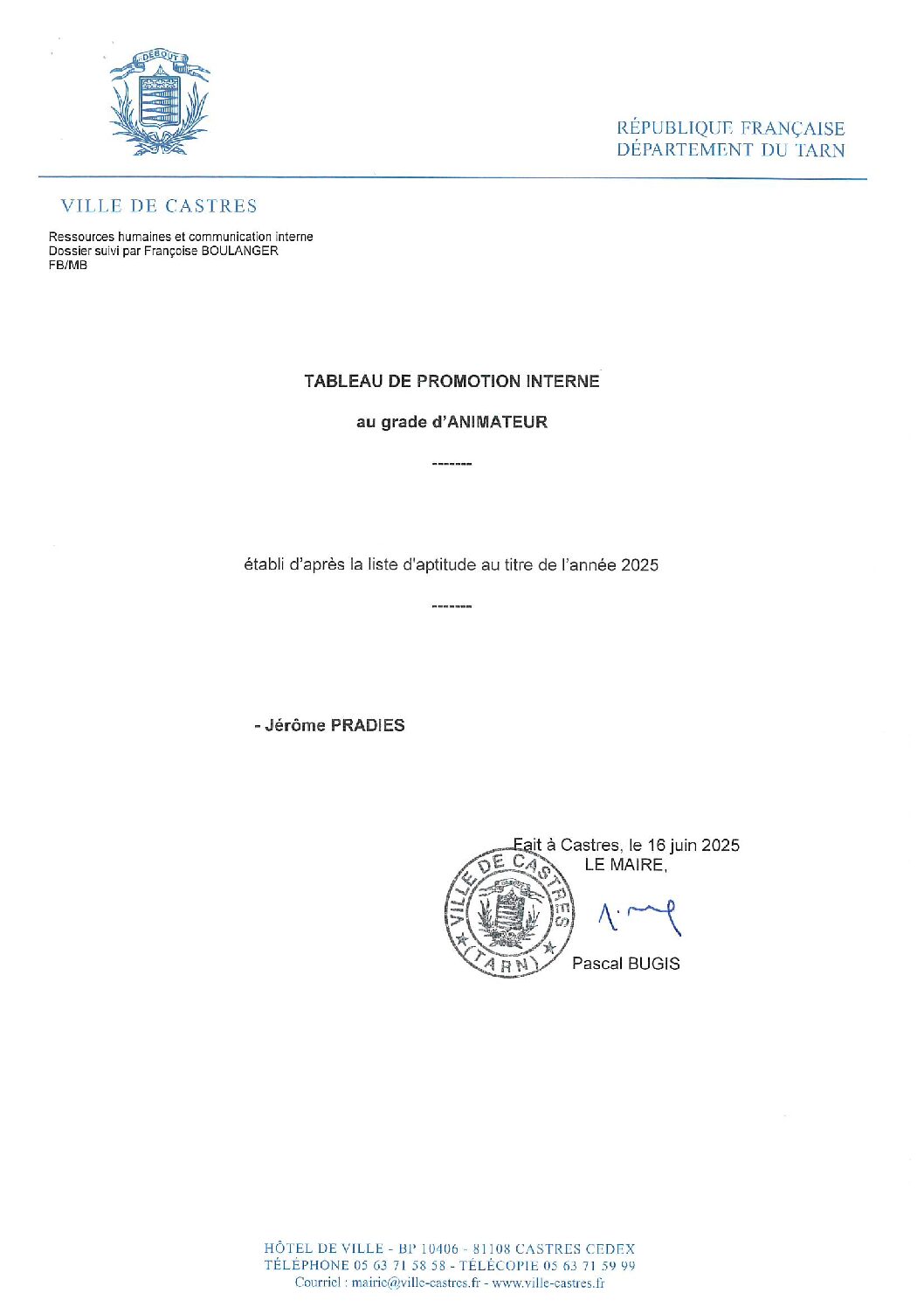 Voir l'image agrandie Liste d’aptitude promotion interne : mairie de Castres Liste d’aptitude promotion interne mairie de Castres Type de fichier : pdf File Size: 215 Ko Catégories: Listes aptitude suite à promotion interne Balises : aptitude, arrêté, interne, liste, promotion Par Thomas|2025-12-09T18:00:20+01:0009/12/2025|Commentaires fermés sur Liste d’aptitude promotion interne : mairie de Castres Share This Story, Choose Your Platform! FacebookXRedditLinkedInWhatsAppTelegramTumblrPinterestVkXingEmail À propos de l'auteur : Thomas
