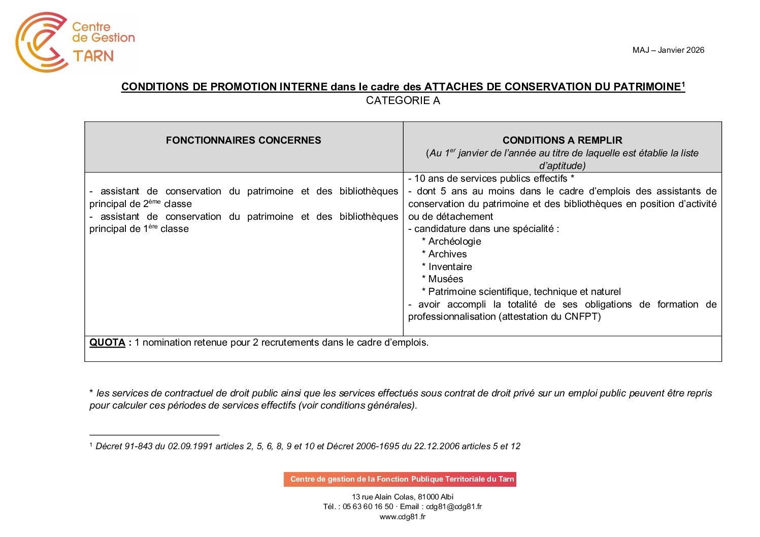 Voir l'image agrandie Promotion interne : attaché de conservation du patrimoine Fiche de promotion interne d’attaché de conservation Type de fichier : pdf File Size: 160 Ko Catégories: Conditions de promotion Balises : attaché de conservation, interne, promotion Par Thomas|2026-02-02T15:04:57+01:0009/12/2025|Commentaires fermés sur Promotion interne : attaché de conservation du patrimoine Share This Story, Choose Your Platform! FacebookXRedditLinkedInWhatsAppTelegramTumblrPinterestVkXingEmail À propos de l'auteur : Thomas