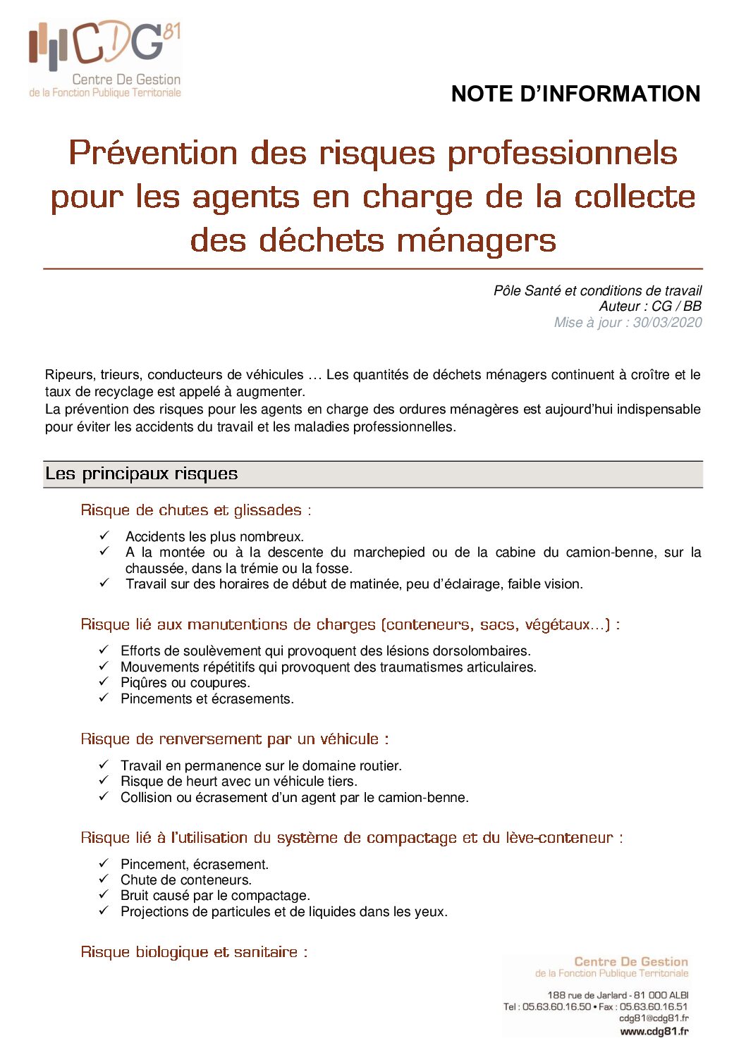 Voir l'image agrandie Risque pro : Collecte d’ordures ménagères Prévention des risques du métier de collecte des ordures ménagères Type de fichier : pdf File Size: 366 Ko Catégories: Prévention des risques professionnels Balises : document unique, métiers, prévention, risques, services techniques Par Thomas|2025-12-09T17:50:40+01:0009/12/2025|Commentaires fermés sur Risque pro : Collecte d’ordures ménagères Share This Story, Choose Your Platform! FacebookXRedditLinkedInWhatsAppTelegramTumblrPinterestVkXingEmail À propos de l'auteur : Thomas