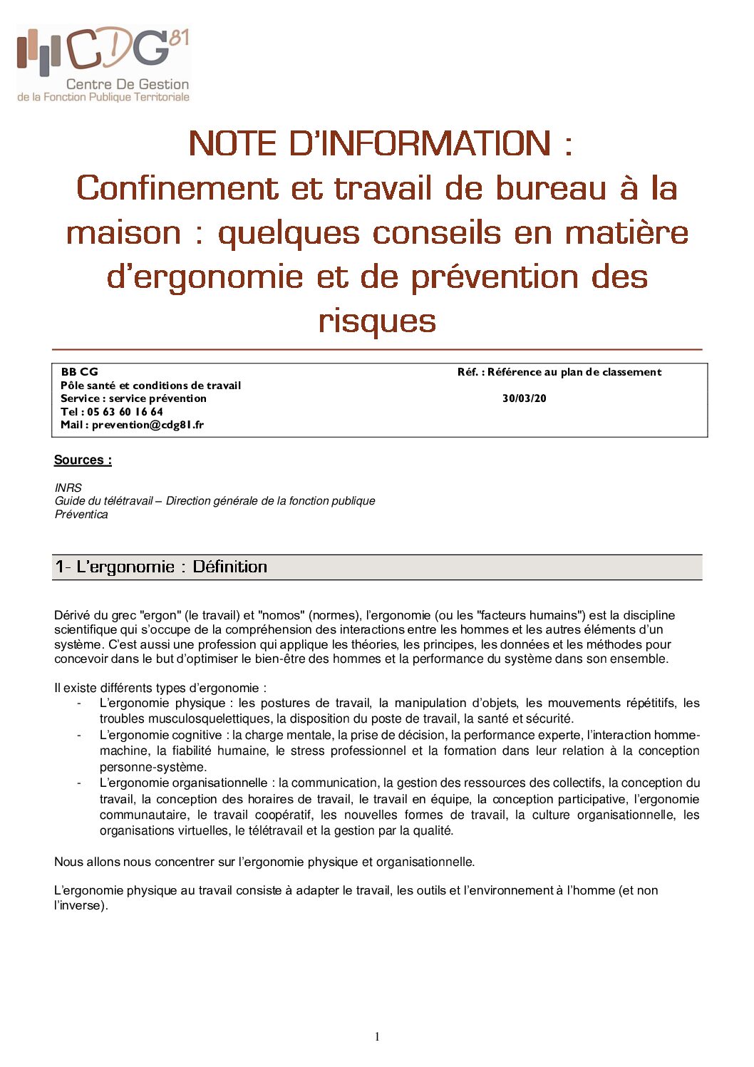 Note « Confinement et travail de bureau à la maison : quelques conseils en matière d’ergonomie et de prévention des risques »