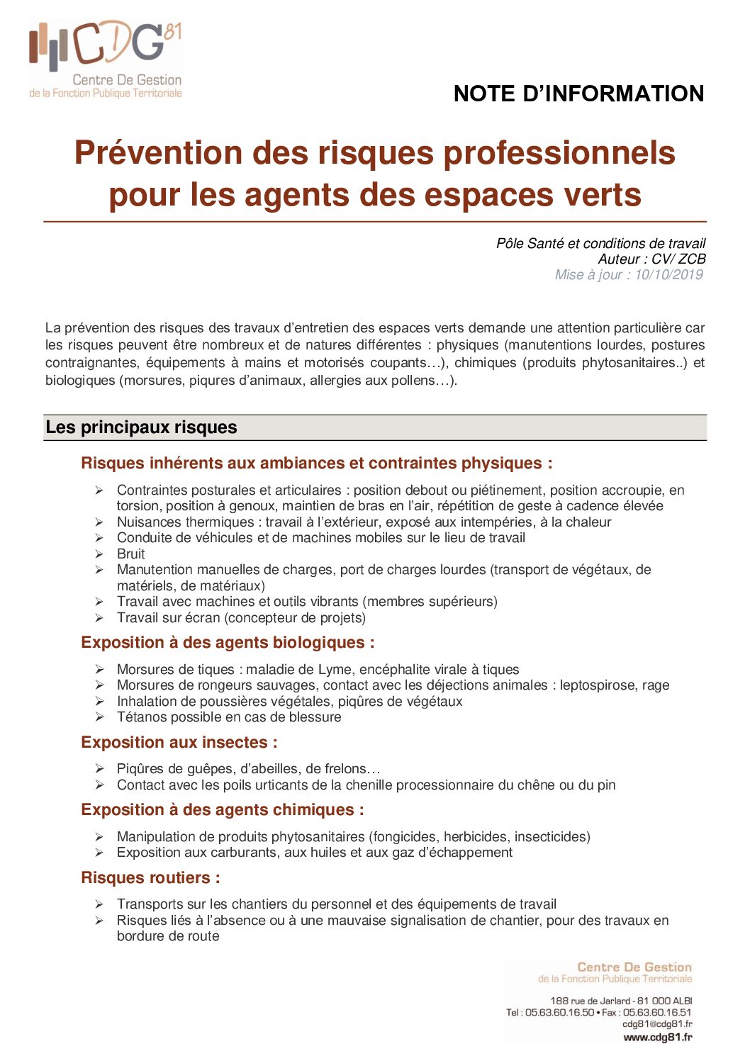 Note d’information sur la prévention des risques pour les agents des espaces verts