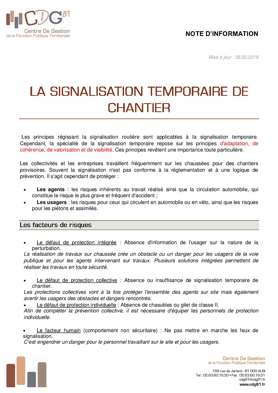 Note présentant la signalisation temporaire de chantier à mettre en place en cas de travail sur la voie publique