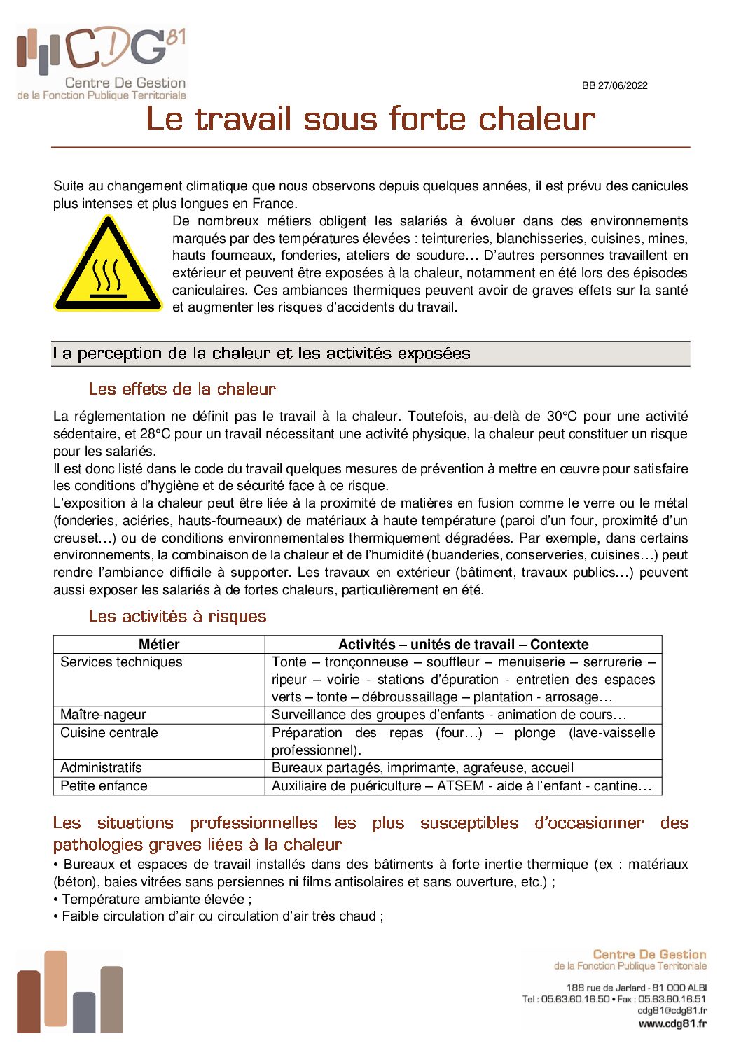 Voir l'image agrandie Risque pro : Note d’information Travail et forte chaleur Que mette en place en cas de forte chaleur pour les agents territoriaux Type de fichier : pdf File Size: 289 Ko Catégories: Prévention des risques professionnels Balises : canicule, chaleur, été, forte chaleur Par Thomas|2025-12-09T17:52:31+01:0009/12/2025|Commentaires fermés sur Risque pro : Note d’information Travail et forte chaleur Share This Story, Choose Your Platform! FacebookXRedditLinkedInWhatsAppTelegramTumblrPinterestVkXingEmail À propos de l'auteur : Thomas