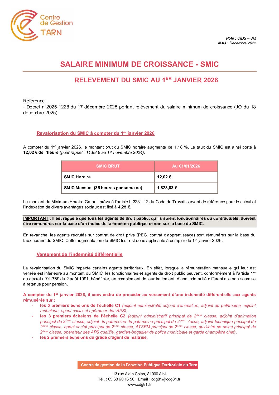 Voir l'image agrandie SMIC : Relèvement au 1er janvier 2026 Note d’information SMIC au 1er janvier 2026 Type de fichier : pdf File Size: 200 Ko Catégories: Smic Balises : 2026, janvier, SMIC Par Thomas|2025-12-18T14:06:09+01:0009/12/2025|Commentaires fermés sur SMIC : Relèvement au 1er janvier 2026 Share This Story, Choose Your Platform! FacebookXRedditLinkedInWhatsAppTelegramTumblrPinterestVkXingEmail À propos de l'auteur : Thomas